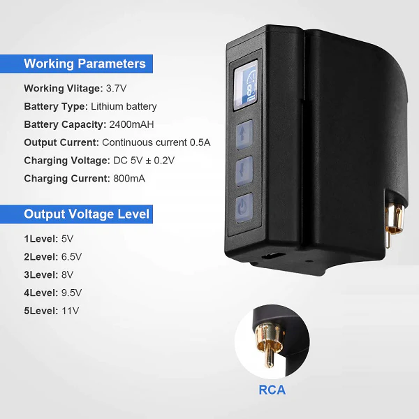 The Portable Battery Power Supply is a 2400mAh capacity lithium battery which powers your tattoo machine. It provides anĀ and efficient performance.
